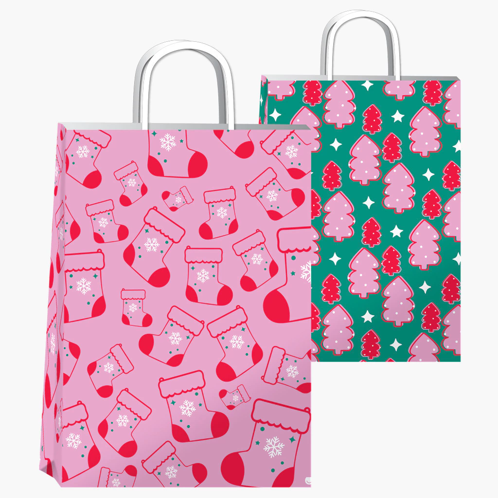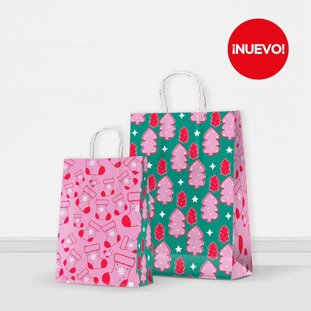 BOLSA PAPEL DISEÑO NAVIDAD ROSA VERDE TEMATICA 30X12X41